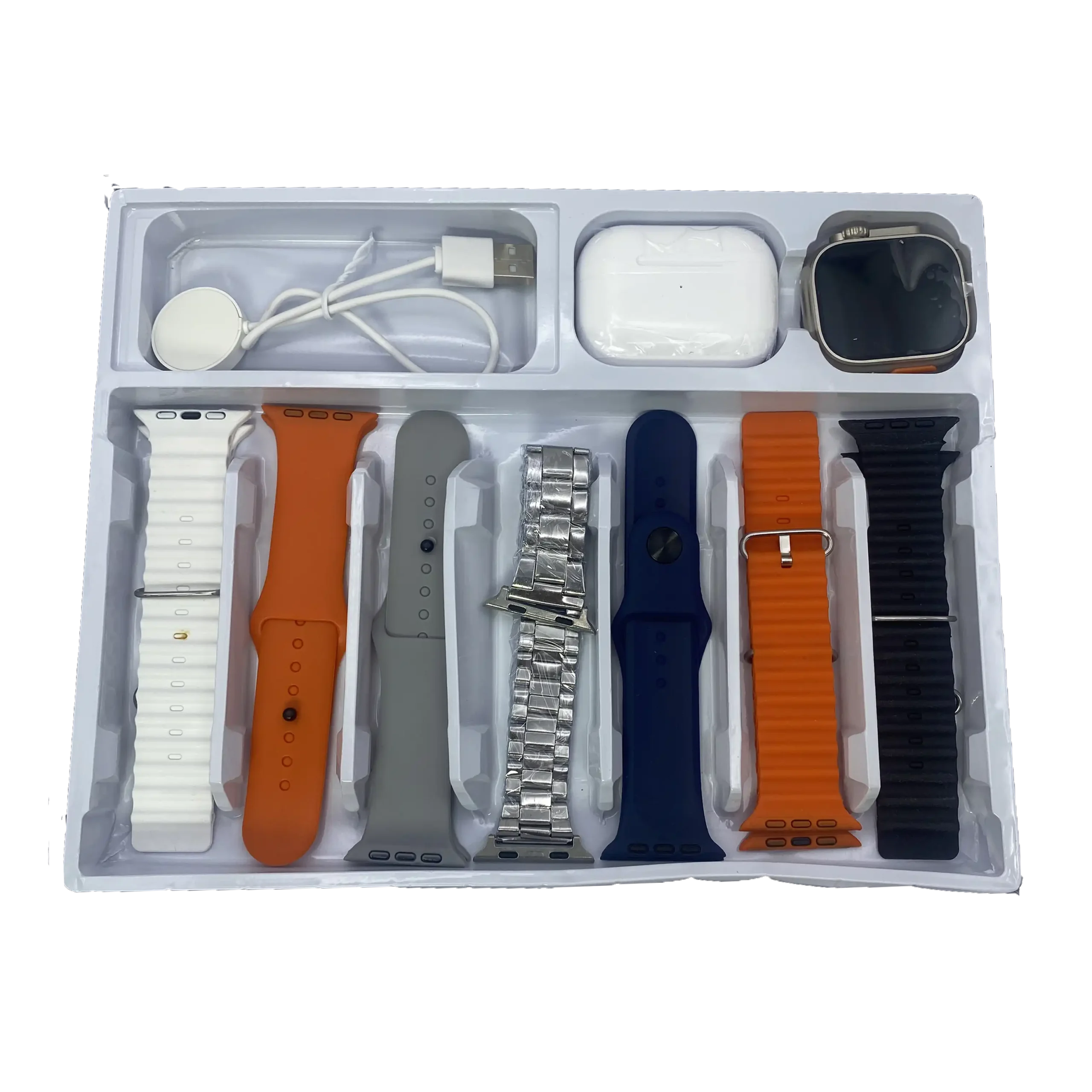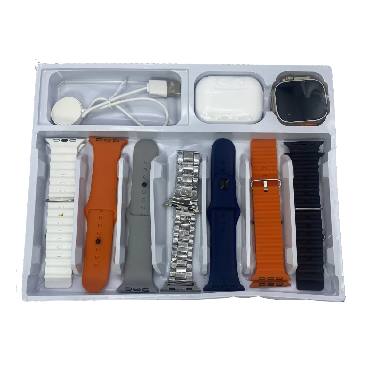 یکی از ویژگیهای منحصربهفرد این ساعت، وجود ۷ بند مختلف در یک پکیج است. این تنوع باعث میشود بتوانید استایل خود را مطابق با لباس یا حال و هوای روز تنظیم کنید. از بندهای اسپرت گرفته تا بندهای کلاسیک، همه در کنار شما هستند تا همیشه خاص و متفاوت دیده شوید. طراحی بدنه ساعت نیز کاملاً مشابه اپل واچ اولترا است و حس حرفهای بودن را منتقل میکند.